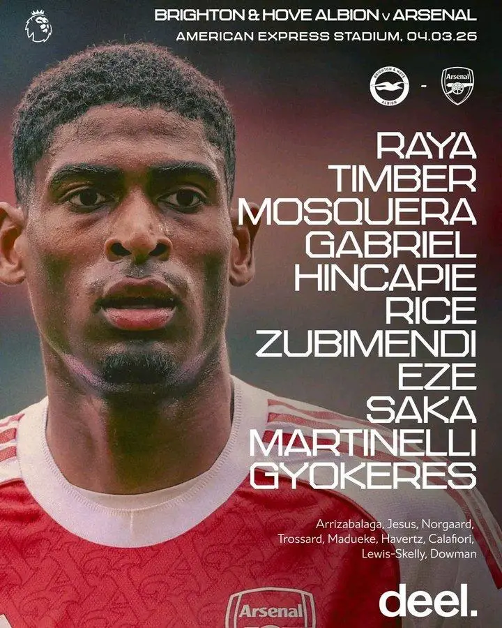 虎扑03月05日讯 北京时间3月5日凌晨03:30,英超第29轮布莱顿对阵阿森纳,赛前双方公布首发:
